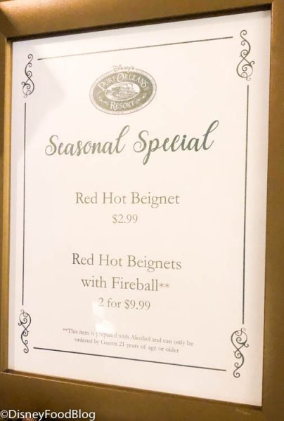 Look for the new Red Hot Beignet (with or without Fireball) currently at Scat Cat’s Lounge in Disney’s Port Orleans — French Quarter! But you’ll have to hurry because we don’t anticipate these guys will be sticking around for very long!