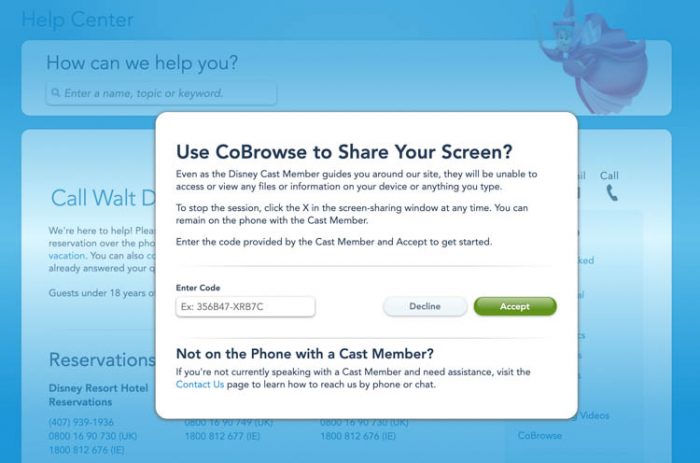 There is a new option listed under the Disney World’s Help category at the bottom of the website called “CoBrowse.” We spoke with a Cast Member who confirmed for us today that it enables you to share your screen with them! The CoBrowse feature only works with a Cast Member using the website’s “Chat Function” which you’ll also see listed on the right-hand of the Help Center’s main page. If you don’t see it when surfing the website, you can click “Contact Us Now” and it should pop up.