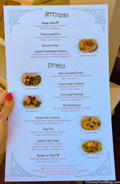 This is an interesting change-up and limits the available options found at this popular turn-of-the-century inspired spot for Lunch and Dinner diners. All-day menus are a fairly common thing around Walt Disney World these days and certainly can help cut a restaurant’s costs down. We’re glad to see a few items we enjoy made the cut (we still got Plaza Loaded Fries, y’all!). Menus can change frequently at Disney World so we’ll keep an eye on the Plaza and let you know of any menu changes as they happen!