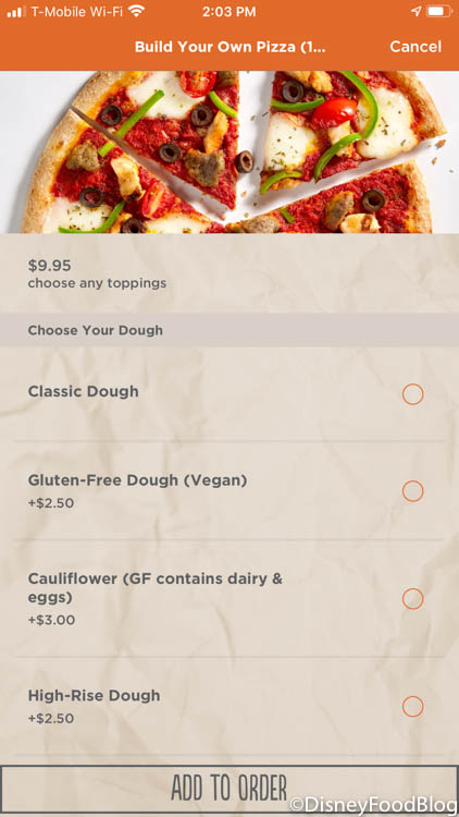First, download the Blaze Pizza app on your phone. Then, launch the app and order from the Disney Springs location — the address is 1508 E Buena Vista Dr b22, Lake Buena Vista, FL 32830. Once you’re on the app you can simply customize your pizza by choosing your crust, sauce, cheese, and toppings! After you look over your order and pay, get thyself to Blaze! Note: you can also schedule your order to be ready whenever you want!