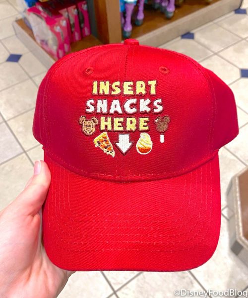 The red hat features some of our favorite Disney eats, like a Mickey Bar and a Dole Whip, and totally has us craving some good food. The hat will cost ya $24.99. You can snag the “Insert Snacks Here” Hat at the Emporium before hopping over to one of the popcorn stands on Main Street, U.S.A.