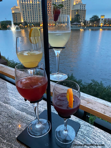 From left to right, we received: Sparkling Sangria, White Sangria, Rose’ Sangria, and Red Sangria.
