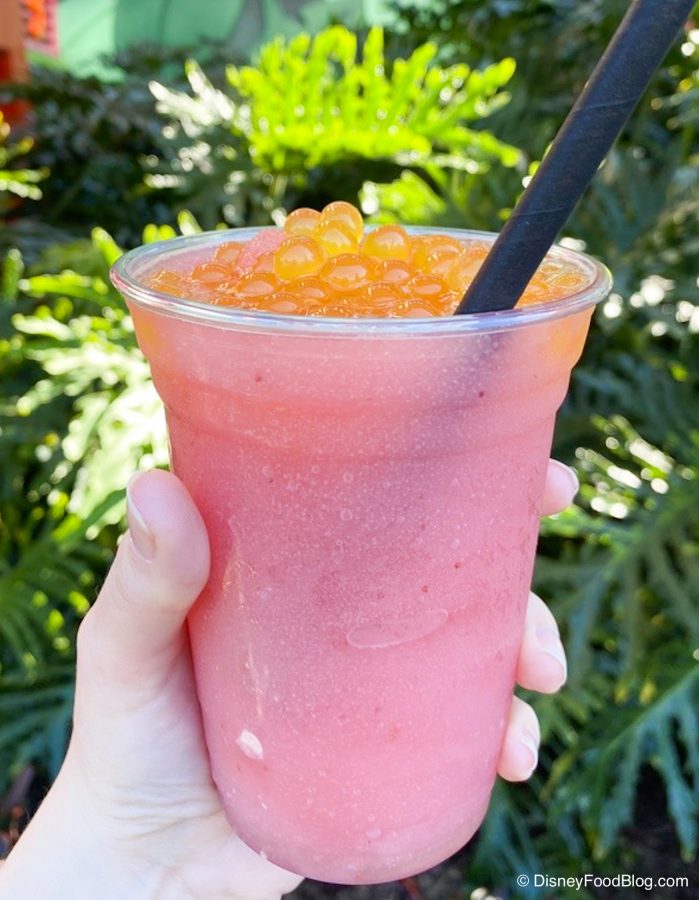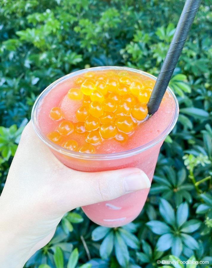 This refreshing beverage is Meiomi Rose Wine with strawberry mix and passion fruit boba balls (just like the Night Blossom from Animal Kingdom)! It says it comes served with a glow cube but unfortunately ours was missing! If you find yourself in the same situation reach out to a Cast Member because they should be able to get one for ya.