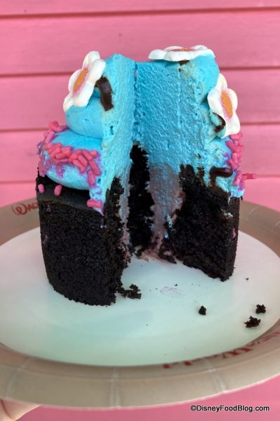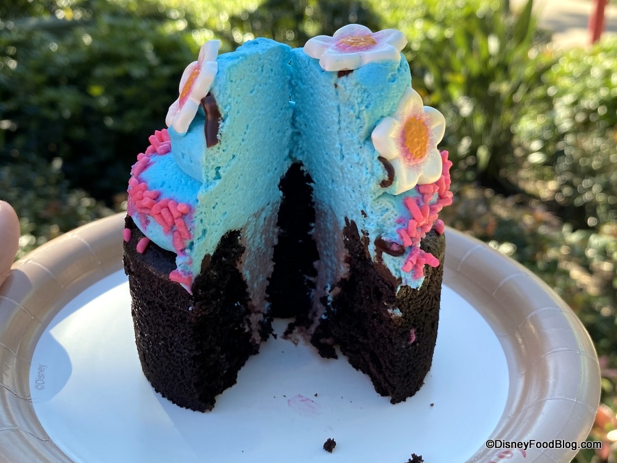 This cupcake features a thick pile of blue frosting with its vivid hue allowing the blossoms to really pop in both their appearance and white chocolate flavor.
