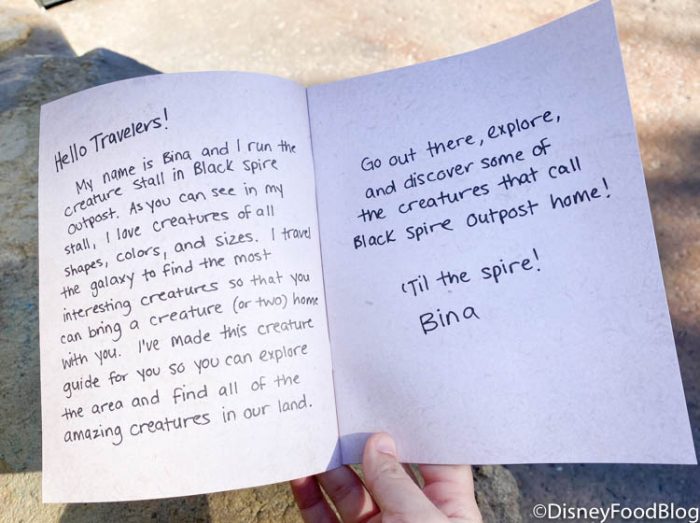 The guide starts with Bina’s introduction! She’s been exploring the wildlife in Batuu for some time, so she knows all the places these creatures like to hide! And although the Cast Member who gave us the booklet says its geared towards ages 3-9, we think this would be a fun Star Wars: Galaxy’s Edge scavenger hunt for the entire fam!