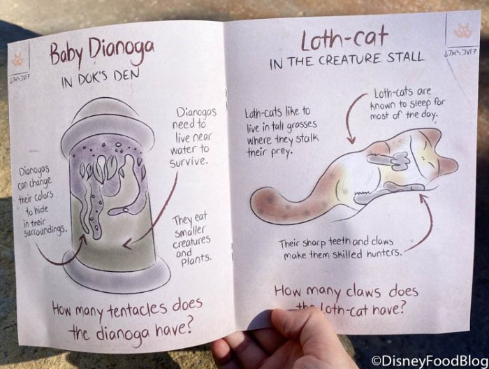 It’s called Bina’s Guide to the Creatures of Batuu and it looks just like a children’s storybook! The booklet is illustrated with “hand-drawn” studies of all the critters you can meet in and around the Black Spire Outpost! Too cute!