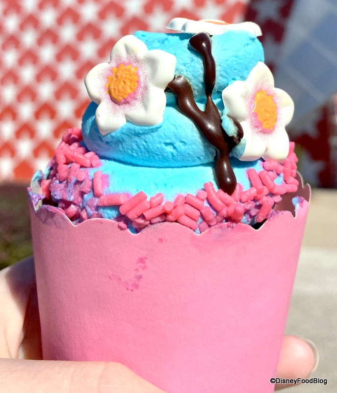 At Intermission Food Court, we found a couple of cute cupcakes that we hadn’t seen before. One is a Mulan Cherry Blossom Cupcake for $5.99. The detail on the flowers looks amazing and yummy, too!