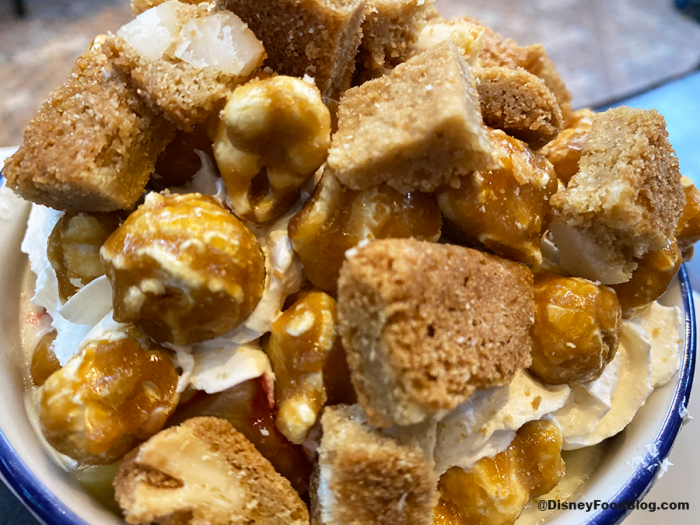 Clearly, we weren’t stuffed from the pretzel alone! So, we decided to try the Adult Sundae! Priced at $9.00, we received a heaping pile of vanilla gelato, rum roasted pineapple (that’s where the ‘Adult’ comes in!), white chocolate macadamia cookies, pralines, whipped cream, strawberries, and caramel corn.