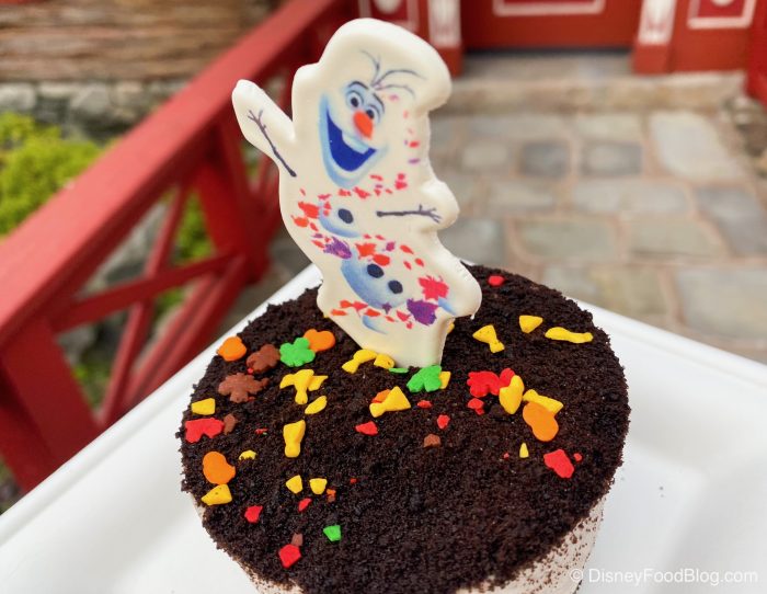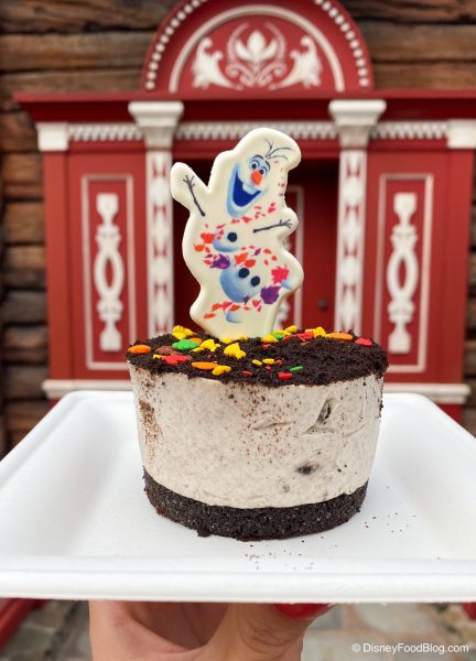 The Olaf Lemon Cheesecake is now the Olaf Oreo Cheesecake!!! Much like the lemon cheesecake, this thick, round slice of cheesecake comes topped with an adorable Olaf chocolate figurine. And look, it’s Gale. Hi Gale!