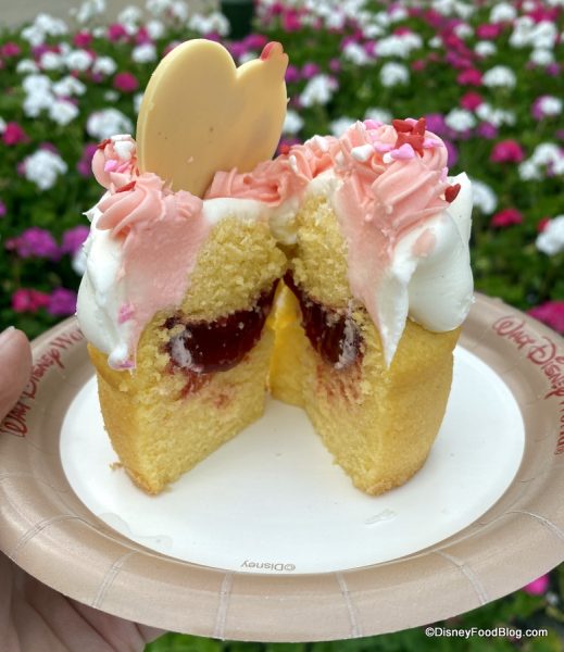 The Cherry Almond Cupcake (which is $5.99 or a Disney Dining Plan snack credit) joins the trio of Red Velvet Whoopie Pies to make up Gasparilla Island Grill’s Valentine’s Day treat offerings. Check out our review of the Whoopie Pies here so you can know which treat is the perfect match for you and YOUR Valentine!