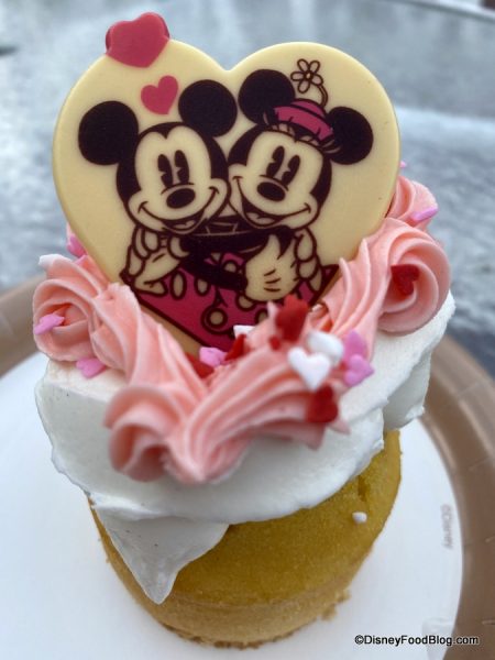 The substantial heart-shaped white chocolate topper features Mickey and Minnie in celebration of Valentine’s Day. It is placed atop a simple buttercream icing in pink and white, dotted with tiny heart sprinkles.