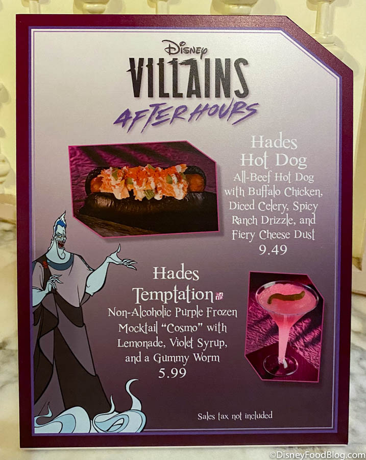 If you want to test your heroics by trying the Hades Hot Dog you can find it at Casey’s Corner during Villians After Hours for $9.49. This is also where you can find the Hades Temptation, which is a returning drink from the 2019 Villains After Hours events.