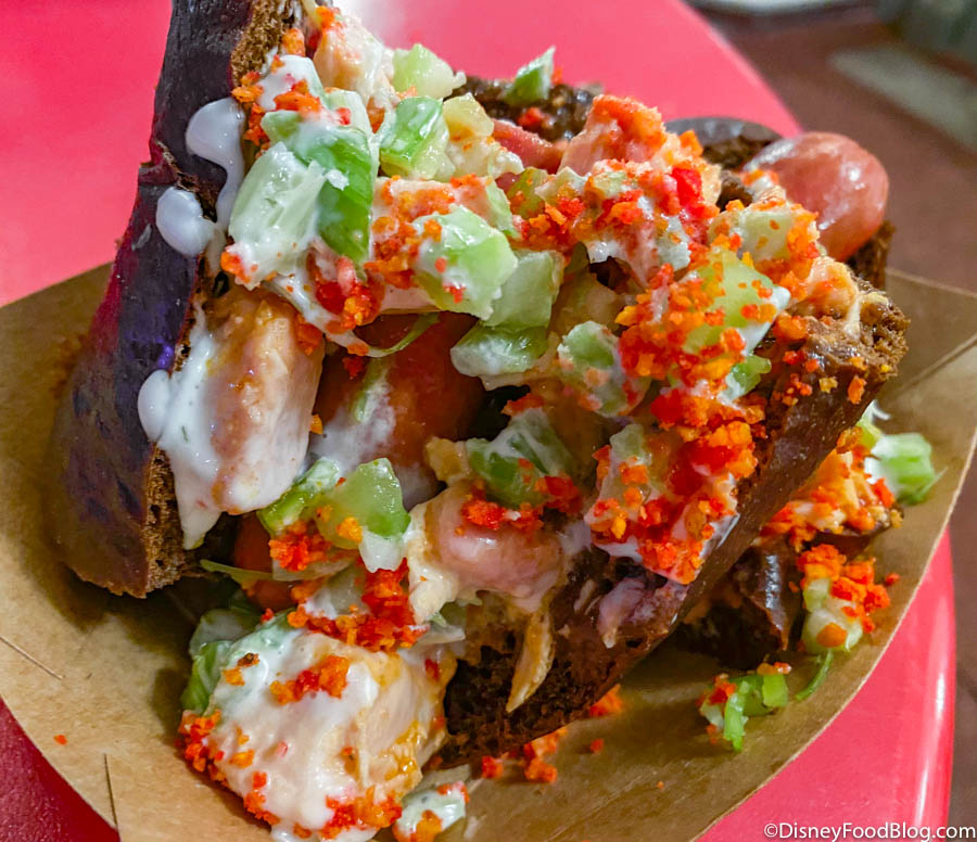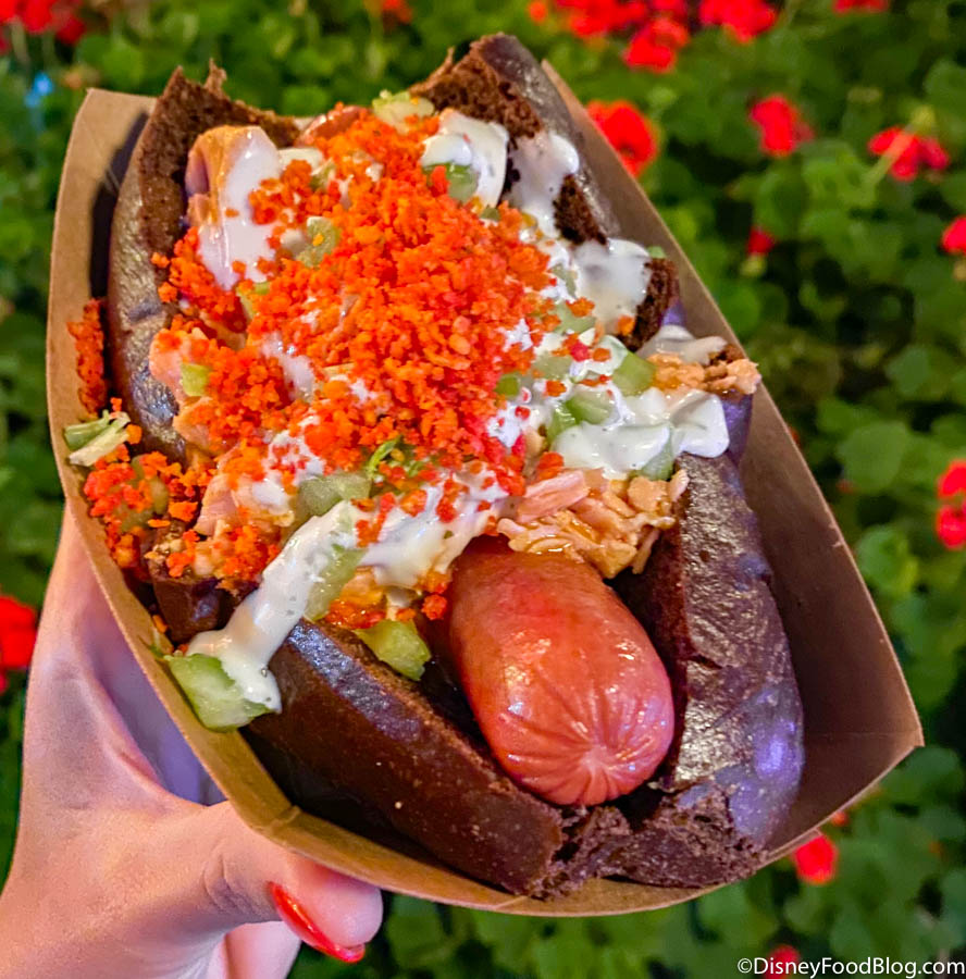 This thing comes LOADED with toppings and tbh, it’s awesome! Maybe the black bun makes this Villains After Hours treat look a little gloomy, but it certainly has a nice kick to it!