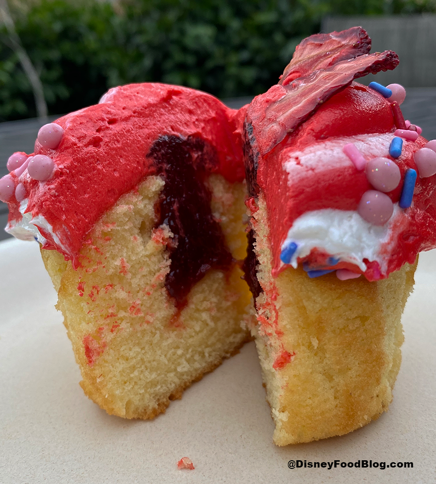 While the icing was bright in color, it’s light in flavor. The strawberries are dried, meaning they’re thin and don’t carry much flavor. While this cupcake is bright and beautiful on the outside, it’s nothing to write home about. The flavors are good, but didn’t wow us!