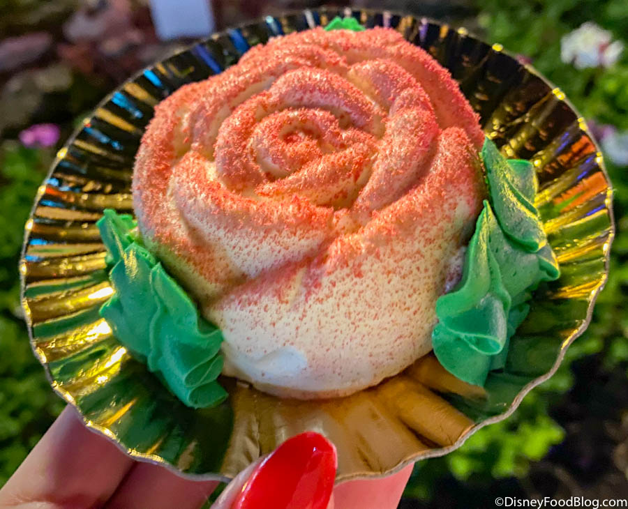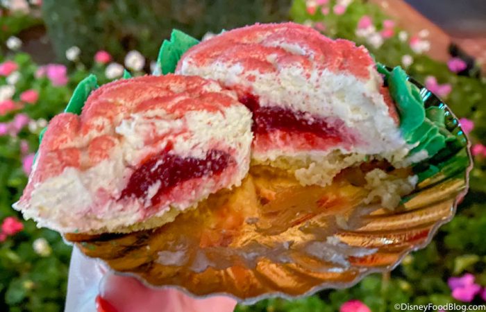 This party-exclusive treat features a cheesecake mousse with raspberry gelée, red cocoa butter, and buttercream leaves. And y’all, this thing is SO pretty! We never thought we’d agree with the Queen of Hearts, but this rose definitely looks really nice painted red.