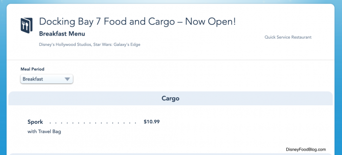 If you want to take a small piece of your galactic travels home with you, Docking Bay 7 is adding a li’l space flair to your kitchenware collection — at least according to the menu! We spotted spork on the Docking Bay 7 menu online (and we’re ready to use ALL our galactic credits to have a drawer-full).