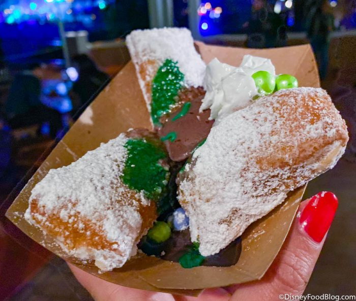 We also tried the other villainous offering at Sleepy Hollow, Just Take Three! It features three beignets dusted with powdered sugar and served with vanilla ice cream topped with whipped cream and chocolate ganache! This fell pretty flat for us. We’re hoping they got hit with a case of first-night jitters!