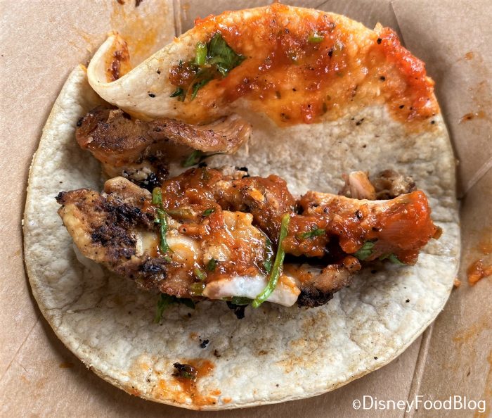 The Taco de Pollo (chicken) is made with marinated grilled chicken, red salsa, and cilantro. While the chicken was executed well, it wasn’t as flavorful as the beef or exciting as the fish. We felt as though it was missing something…but luckily we had just the ticket…