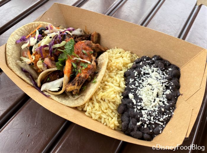 This was so flavorful and delicious. The chicken was cooked perfectly, and the cascabel sauce added a tremendous amount of flavor. We also loved the acidity from the pickled onions. To kick it up a bit, we added some salsa from the condiment bar, and the Chipotle added the perfect amount of heat to the dish. This is one we’d absolutely order again — and all things considered, this is a somewhat healthier option at World Showcase.