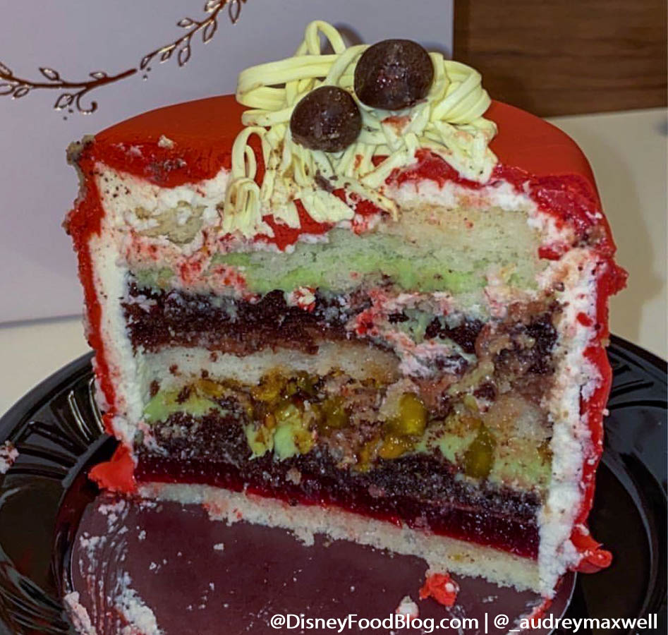 Thanks to @_audreymaxwell, we can now see this cake INSIDE and out! This adorable creation appears to have been inspired by Italian Spumoni and includes layers of vanilla chiffon cake, chocolate biscuit, dark chocolate mousse, pistachio mousse, cherry pate de fruit (chewy gel), and candied pistachios.