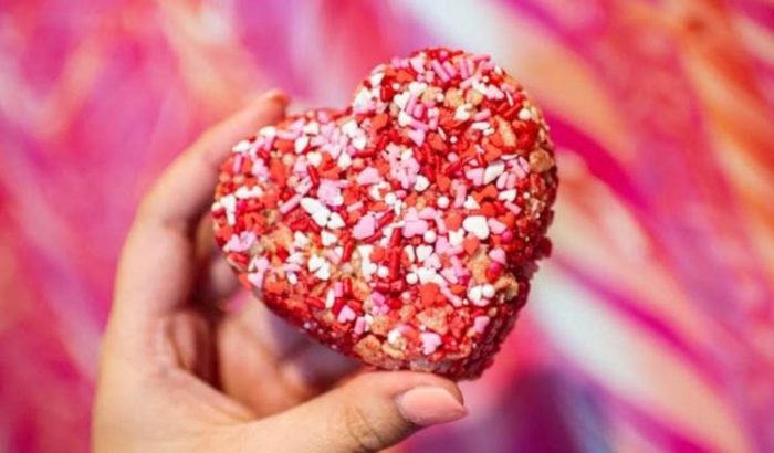 Or how about this Valentine’s Day Crispy Treat? This raspberry and cream-flavored Rice Krispie is sprinkled with colorful heart-shaped candies, perfect for sharing with a loved one!