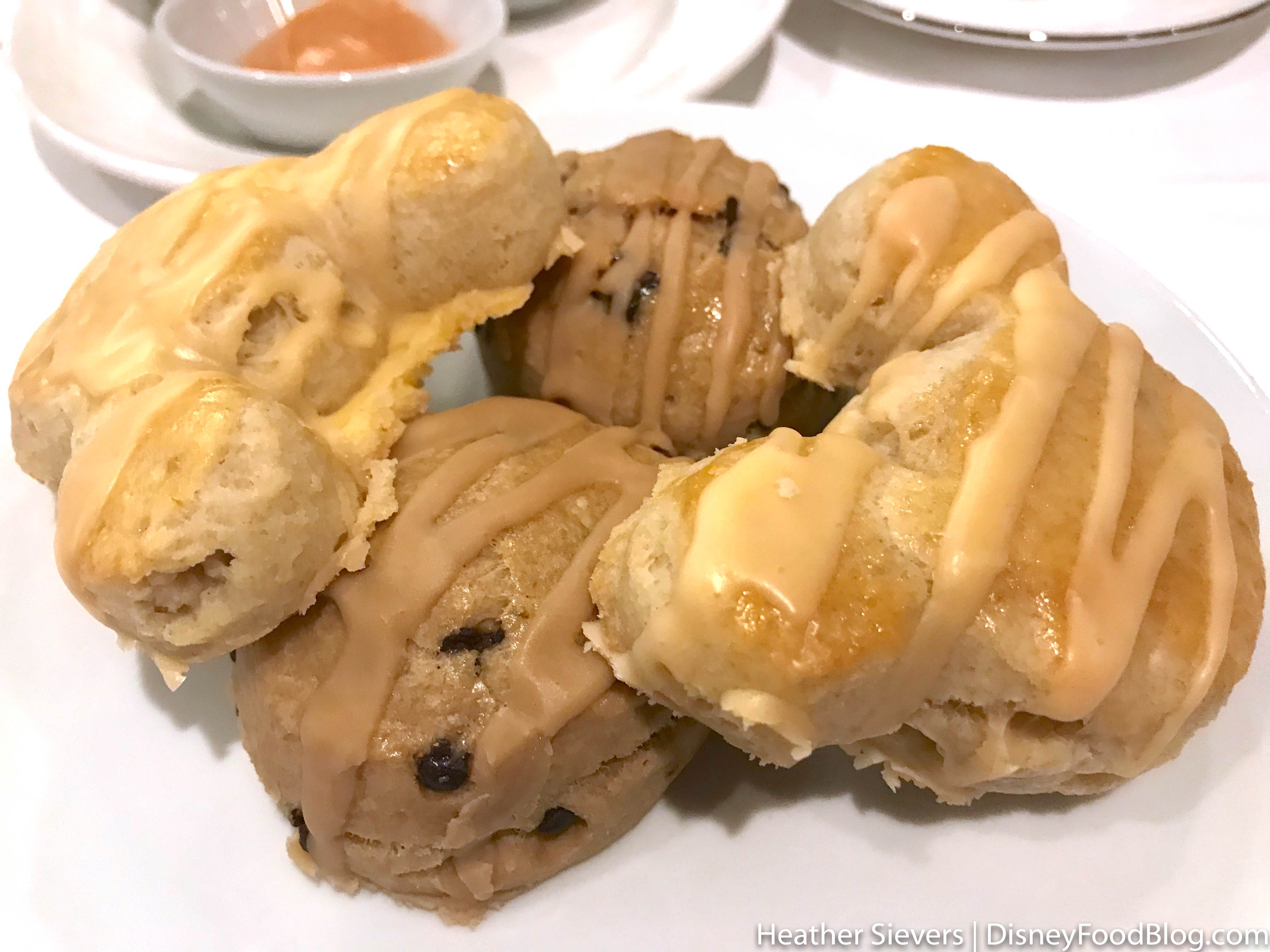On the lowest level, you’ll find a selection of Traditional Scones. The adorably Mickey-shaped ones are lemon-based with blood orange glaze on top while the round ones are mocha-flavored with chocolate chips and an espresso chocolate glaze!