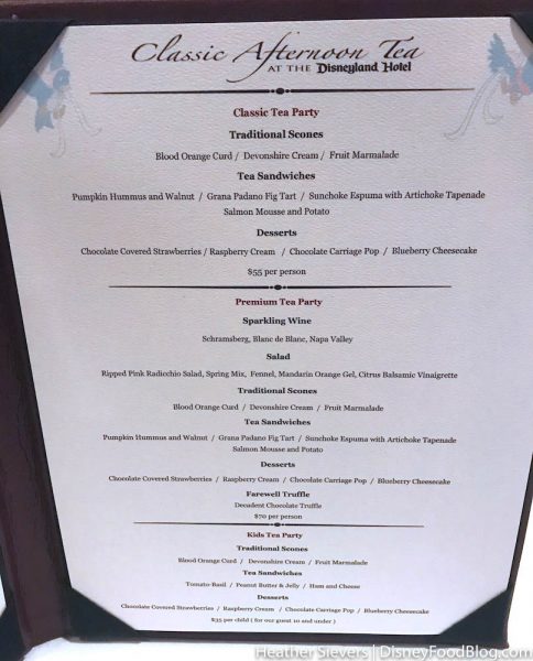 And now the moment you’ve all been waiting for! It’s time to talk about the special Cinderella Tea Party eats! The menu is separated into Classic Tea Party ($55) and Premium Tea Party ($70) sections. The Premium Tea Party includes the same offerings as the Classic menu, with the addition of sparkling wine, salad, and a farewell truffle. A Kids Tea is also available with the more approachable foods for $35 per child.