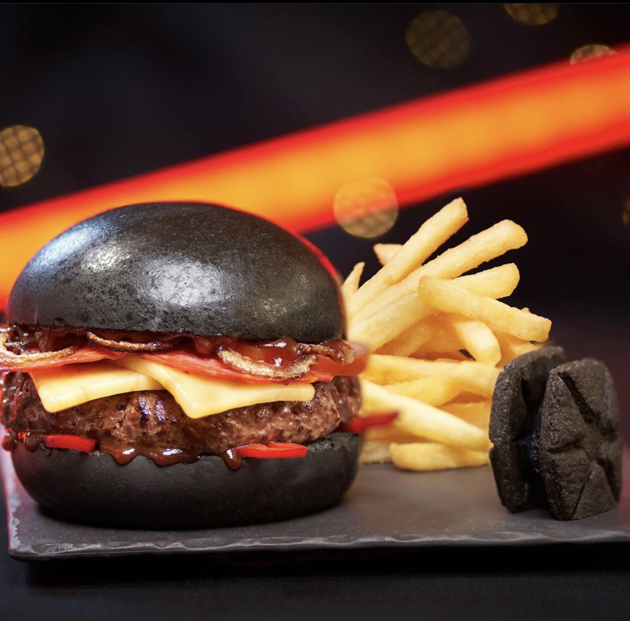 The TIE Fighter burger is served with Pepper Jack Cheese, Chorizo, Tomatoes, Onions, Pepper, and a Chipotle BBQ Sauce. This one reminds us of the First Order Burger we had previously seen in Disneyland!