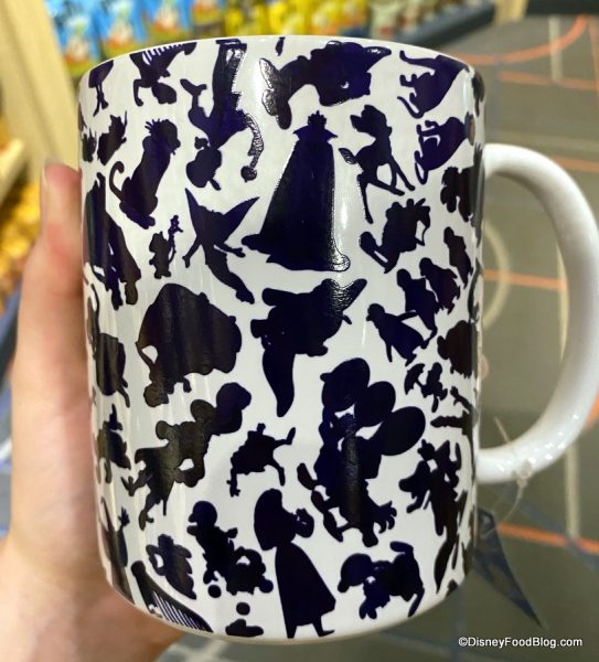 Silhouettes of beloved characters such as Bambi, The Three Caballeros, Tinker Bell, Jiminy Cricket, Snow White, and MANY more decorate the mug as it sits on the shelf.