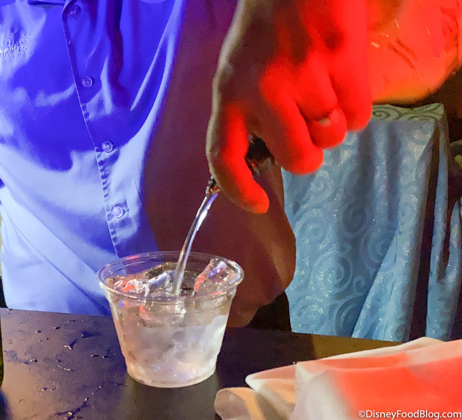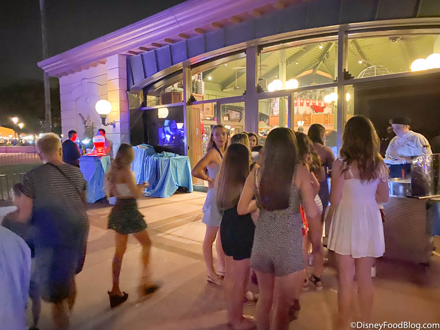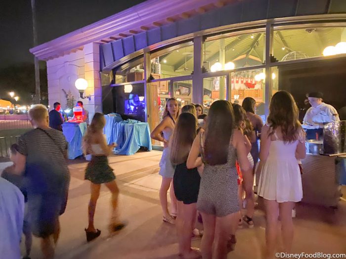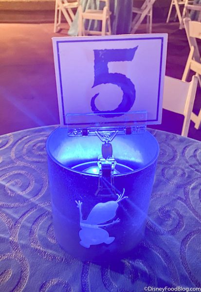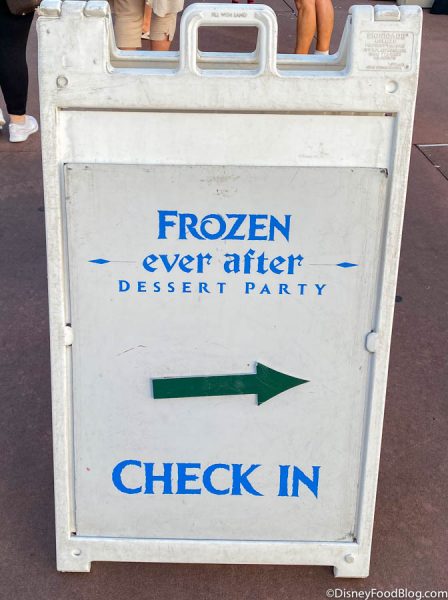 The Frozen Ever After Dessert Party seating started promptly at 7:45PM. Since all seats are assigned and everyone is guaranteed a seat, you don’t have to sweat it if you don’t show up right on time! But, if you’re like us, you may want to get there right when it starts so you can get your money’s worth on food and drink!
