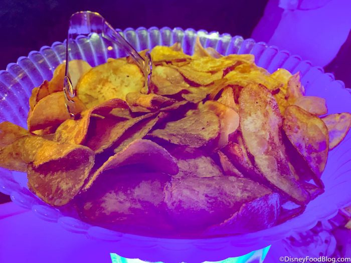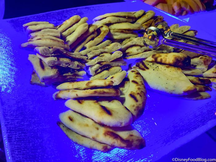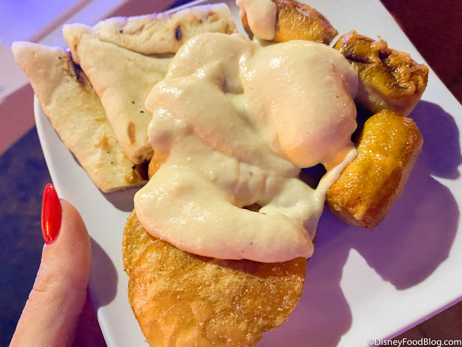 Now we’re talkin’! Check out this SPREAD! This by no means replaces a proper supper for us, but who can resist a plate of cheesy, salty carbs? We thought the Cheese Fondue was rich, but a little on the thick side, while the Grilled Flatbread tasted similar to naan. The Pretzel Bites were pretty basic (like the frozen kind you can get at the grocery store), and the House Fried Chips are the same ones Disney serves at its counter-service restaurants — so nothing special, but still very satisfying!