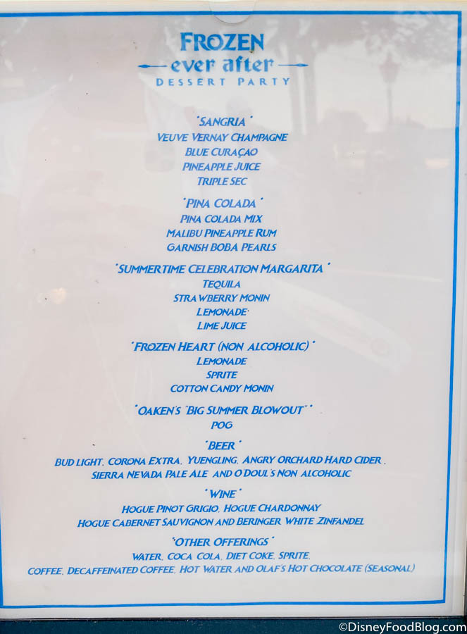 First, we hit up the drinks! You’ll find an extensive bar menu at the Frozen Ever After Dessert Party featuring everything from made-to-order cocktails, non-alcoholic specialty drinks, beer, wine, and other offerings.