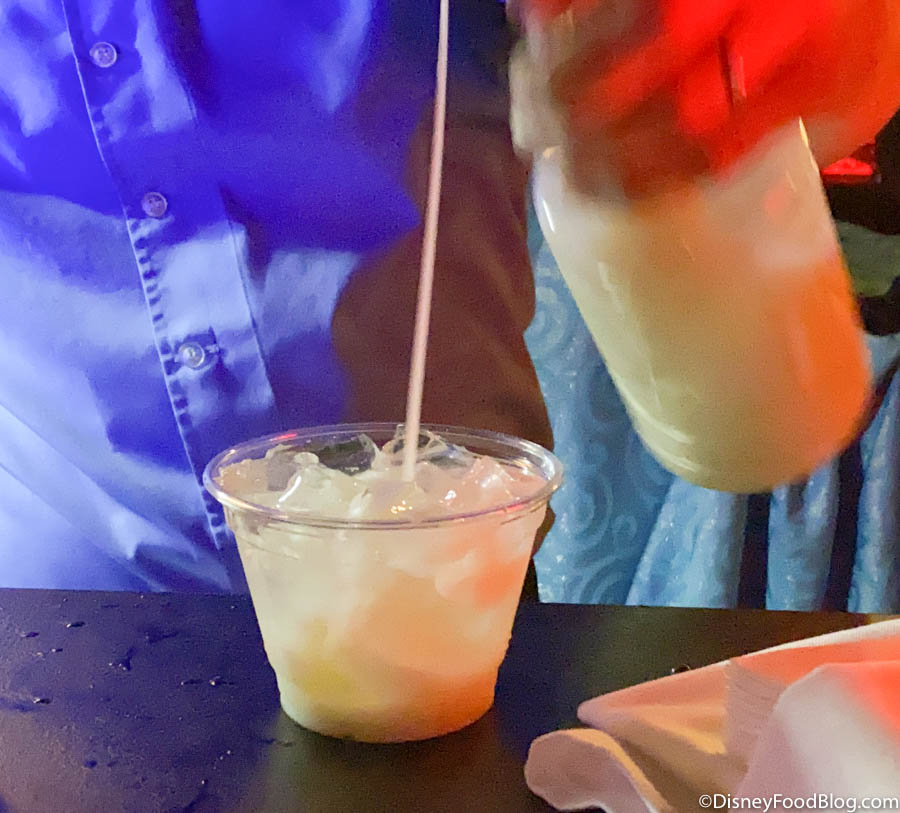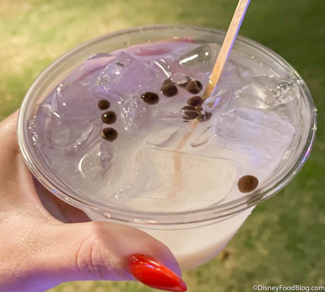 It was a good, classic Piña Colada with a pretty decent pour of rum! They were out of Boba Pearls, so we ended up with Crispy Pearls, like we’ve seen on some of the park’s baked treats, instead. (Weird, right? Why would they DO that?) They kinda looked like little capers just floating on top, so we’d just pass on those next time! We normally drink our Piña Coladas frozen, but this one still tasted yummy.