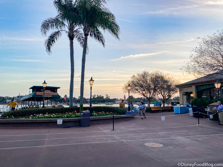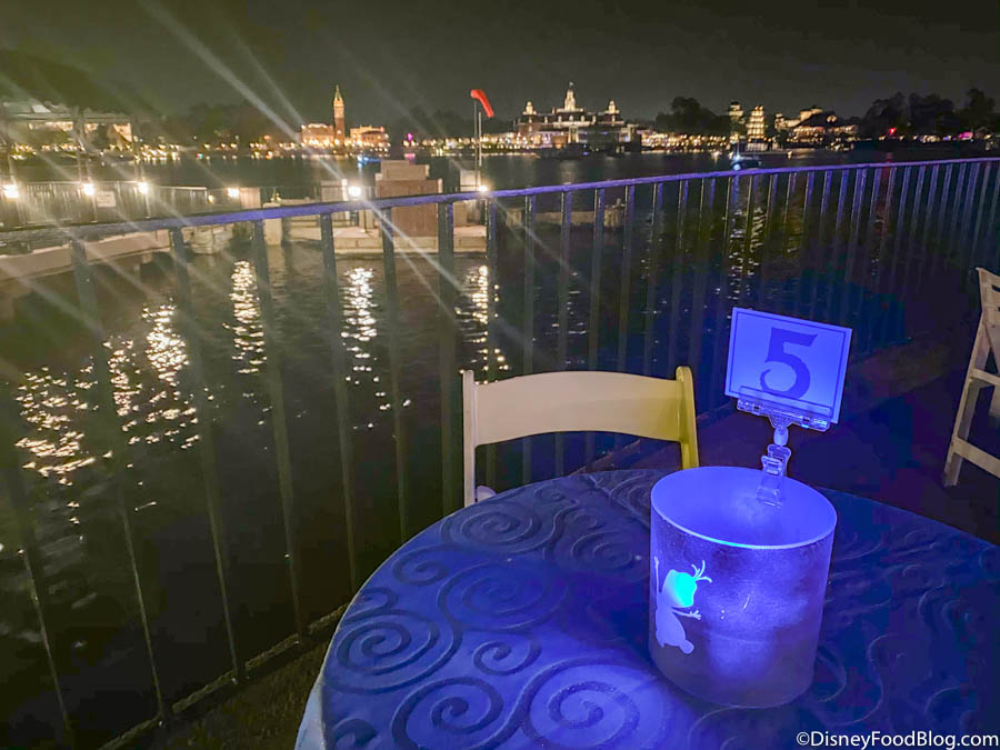 Check out that gorgeous, unobstructed VIEW! Our table was right on the water of the World Showcase Lagoon! There was one row of tables behind ours that were distanced slightly further back, but since they were staggered, it looked like the guests sitting there also had a relatively unobstructed view.