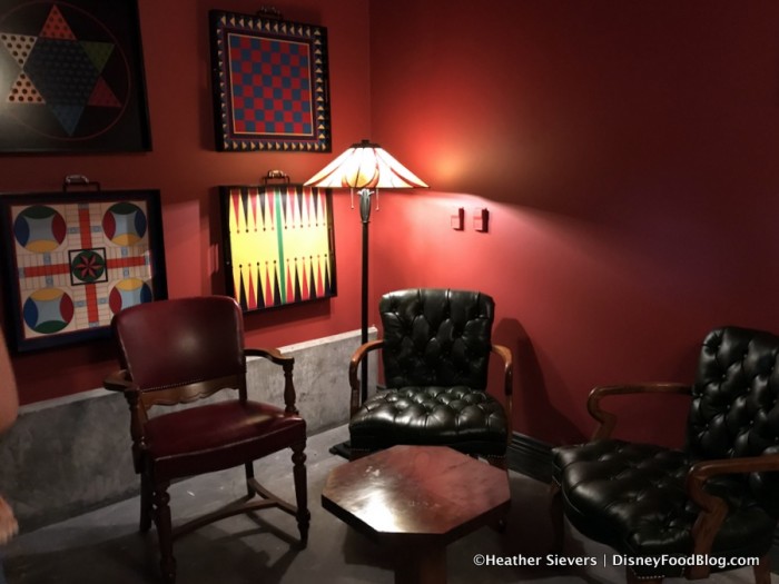 The walls are decorated with illustrations of Pixar animators. There are also game boards such as checkers, backgammon, and Parcheesi hanging on the walls ā which guests are allowed to use!