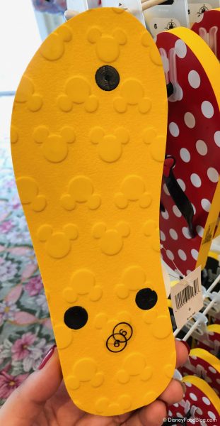 One foot is for Mickey, and the other foot is for Minnie! The bottom of each one is a bright yellow design and the pair is $14.99