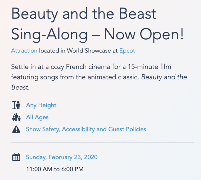 And lastly, the final performance for the new Beauty and the Beast Sing-Along will be 6 PM instead of 7 PM starting February 23rd!