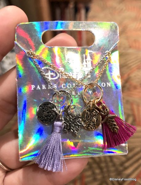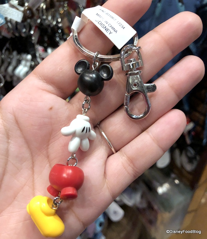 We get that it’s supposed to be the signature parts of their respective outfits, but it just took us by surprise to see all of the pieces of their wardrobes (including Mickey’s head?) strung on a chain like this. Do you agree?!