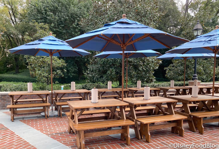 Meanwhile, the outdoor patio is absolutely GORGEOUS! We snapped a few photos of it before we headed inside, but trust us — as soon as people started getting their food, these picnic benches started to fill up quickly!