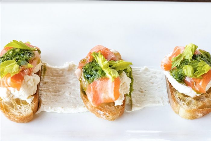 You can choose from smoked salmon crostini made with whipped ricotta and basil pesto, burrata and prosciutto drizzled with balsamic gastrique, and hand shucked oysters served with champagne and black pepper mignonette.