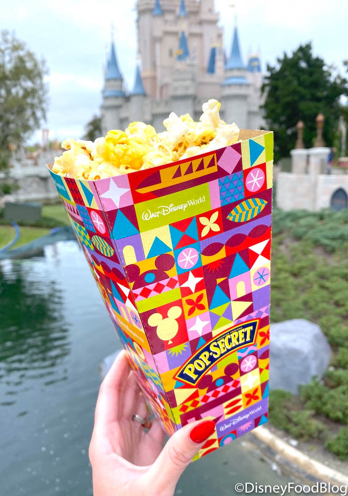 The popcorn box features plenty of bright colors and geometric shapes (Mary would be so proud!). Plus, you can even spot symbols and icons from around the parks on the carton!