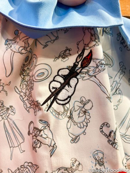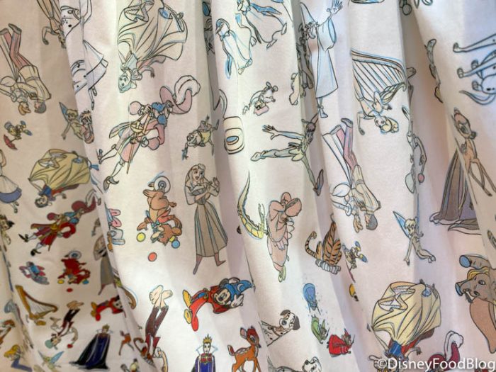 Meanwhile, the body of the dress showcases the Disney characters going through various stages of the animation process! They’re depicted as rough sketches near the top while towards the bottom of the skirt, they become filled in with their familiar palette of colors!