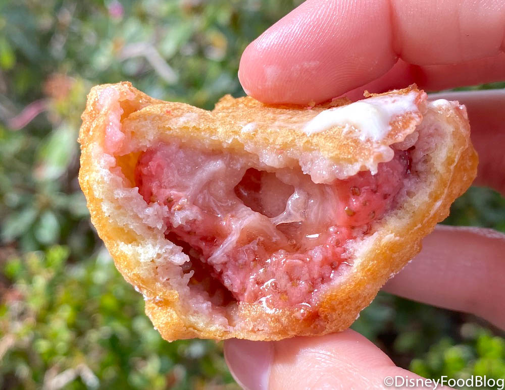 These fritters have a fresh strawberry filling, which is fried and then topped with powdered sugar! And, they even come with a cheesecake frosting dip for a lil extra sweetness. (Plus, you know we couldn’t avoid making a Hidden Mickey!! ;D)