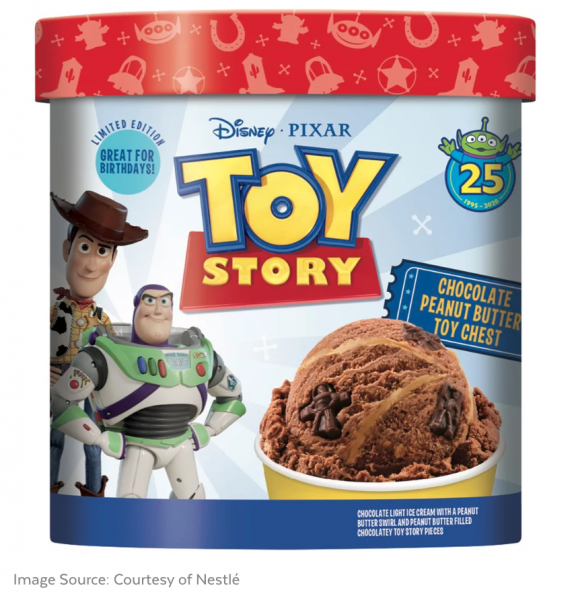 Last but not least, Woody and his merry gang are also getting in on the ice cream biz with their signature flavor, Toy Story Chocolate Peanut Butter Toy Chest Ice Cream! This one is a light chocolate ice cream with a peanut butter swirl and character-shaped chocolate chunks with a peanut butter filling! We can’t wait to eat the little candies pieces shaped like Buzz Lightyear and Woody!