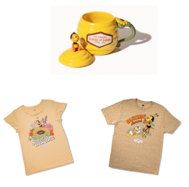 And while Spike the Bee has been popping up more and more at Epcot’s Flower and Garden Festival, this year his Cute as can Bee Collection has us buzzing with excitement! Last year Spike and Donald shared a line of adorable Flower and Garden swag, but this year, Spike the Bee has received top billing with his new style of shirts and mug which resembles a cute little beehive!