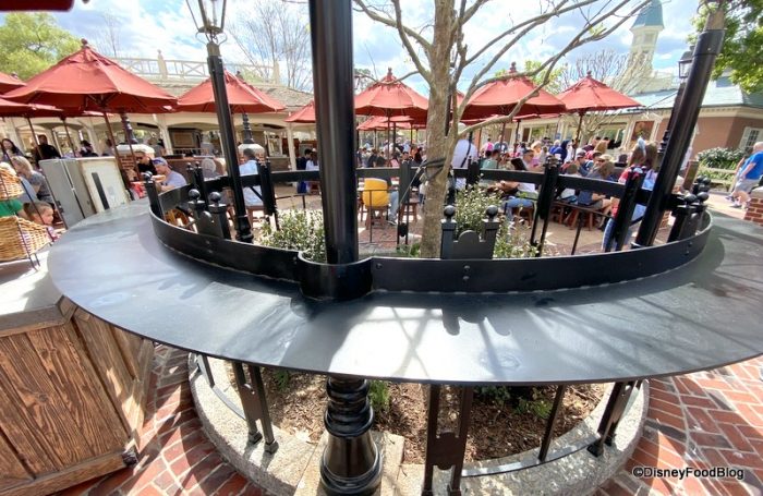 The market has railing around the planters that’s new to us. The rail can easily serve as a table to set your food down on, but, of course, it’s standing room only.