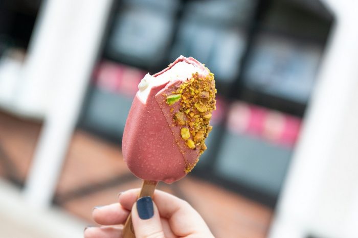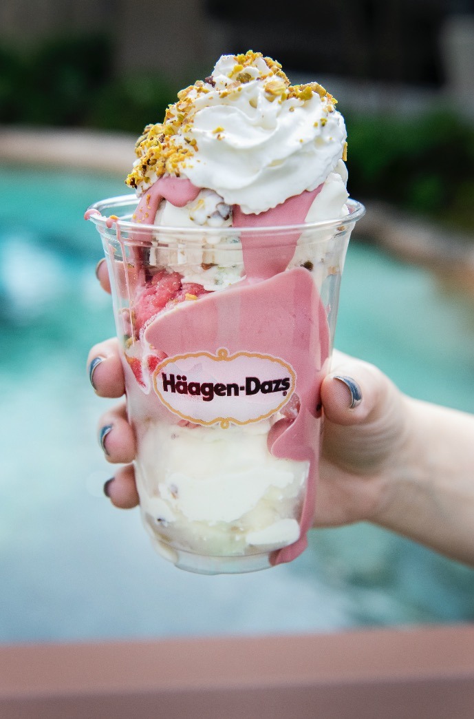You’re looking at the Ruby Cacao Raspberry Pistachio Sundae, which you can currently find for a limited time at Haagen-Dazs in Disney Springs! But it’s not the only Ruby Cacao treat on the menu these days…