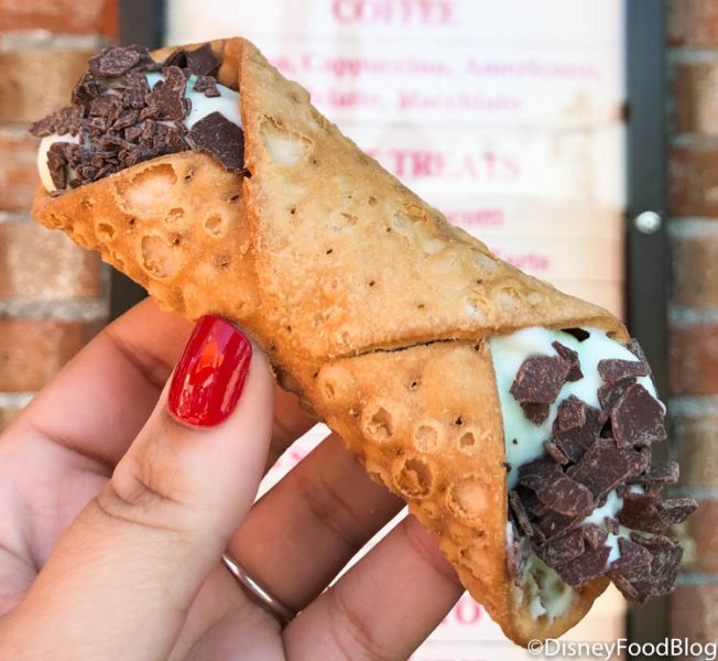 Nothing about this combination of flavors makes any sense, but we actually really enjoyed the Mint Cannoli! Try one for yourself for $6 now at Disney Springs! And when ya do please let us know your thoughts!