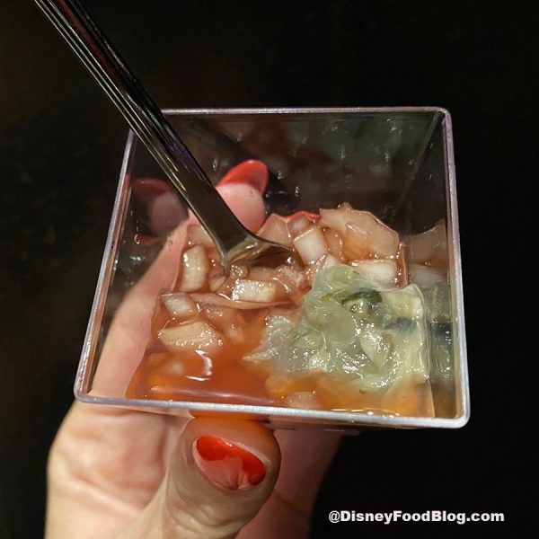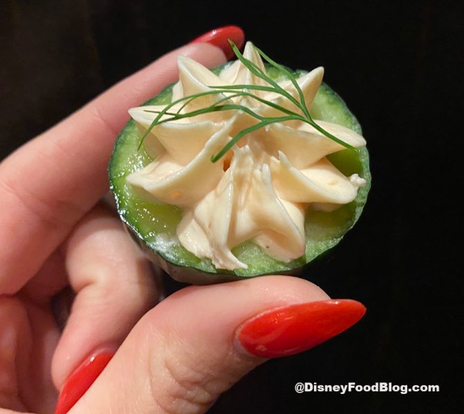 This felt very “fancy party food” to us, like what you picture people eating off servers’ trays in a movie. It was a fresh small bute, thanks to the cucumber and the salmon mousse wasn’t overly fishy.