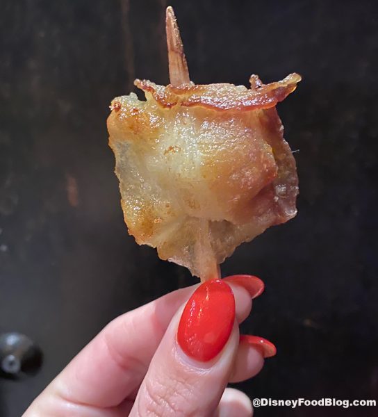 Super straightforward. Salty bacon wrapped around a small scallop.